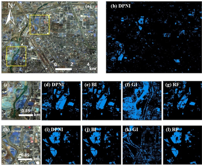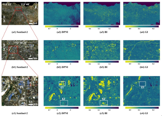 团队提出了一种新的稳健光谱指数DPNI,用于快速准确地绘制DPN地图。在城市复杂环境中的评估结果显示,与BI和GI相比,DPNI更有效地区分了DPN和非DPN土地覆盖物。DPNI制图结果与基于RF的结果相近,然而优势在于它不受样本和参数设置限制,可以实现大规模快速制图。DPNI实现了93.51%-98.83%的总体精度和83.61%-96.54%的F1-Score,且阈值稳定性良好。总的来说,DPNI是第一个DPN的光谱指数,对大规模DPN制图有效。DPNI有望推动DPN的自动化制图方法,并支持评估DPN对环境的影响。