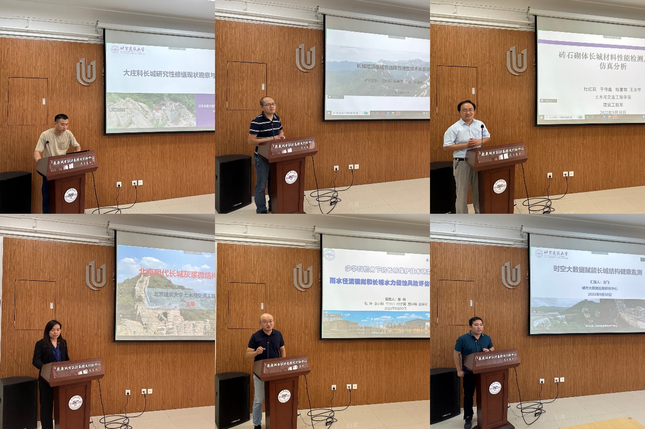 北京北建大建筑设计研究院有限公司工程师王冰、建筑与城市规划学院副教授潘剑彬、土木与交通工程学院副教授杜红凯、土木与交通工程学院副教授王琴、环境与能源工程学院副教授张伟、科学技术发展研究院副教授刘飞等6位特邀嘉宾分别以“大庄科长城研究性修缮勘察与设计”、“长城墙顶面植物选择性清整技术体系研究”、“砖石砌体长城材料性能检测及灾害仿真分析”、“北京明代长城灰浆微结构剖析研究”、“雨水径流模拟和长城水力侵蚀风险评估研究的思考”、“时空大数据赋能长城结构健康监测”为题做交流汇报,介绍了个人及团队在长城保护领域的科研进展和对多学科融合的思考,并与参会嘉宾展开了深入的讨论交流。