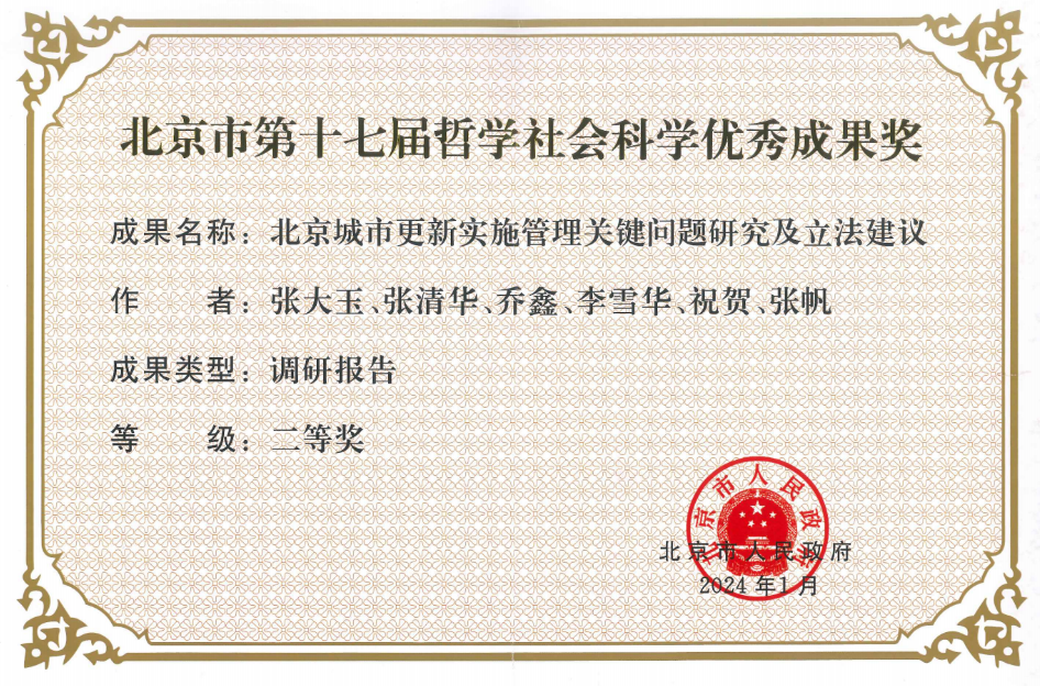 《北京城市更新实施管理关键问题研究及立法建议》:作者为张大玉、张清华、乔鑫、李雪华、祝贺、张帆。该成果聚焦存量时代首都高质量发展的关键问题,以解决“北京城市更新实施管理”难点为导向,总结国内外先进经验,在深入调研基础上汇集各方面意见需求、剖析现实典型案例,识别出北京城市更新面临的紧平衡、多目标、利益主体多元、规划刚性约束强、成本平衡难度大等主要矛盾,梳理更新实施管理层面亟待解决的制度性障碍,搭建了“减量发展背景下的北京城市更新管理与实施机制”的理论框架,提出了针对性的政策建议和立法思路。该成果获市委、市政府、市人大等领导肯定性批示,应用于多个区级行政单元,在《北京市城市更新条例》立项起草、制定实施等工作中发挥了积极作用,体现出重要的决策咨询价值,对全国的城市更新管理制度建设也有显著的参考意义。