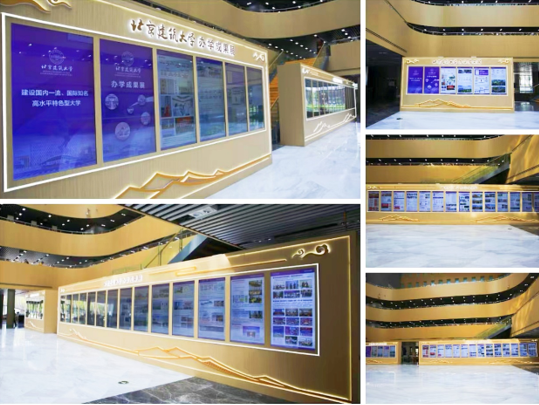 办学成果展示平台位于大兴校区图书馆一层,与服务首都规划建设成果展和老北京旧城模型共同组成学校办学宣传体系。办学成果展示平台共由20块65寸高性能电子显示屏组成,展示形式更加多样,展示内容更加丰富,展示切换更加高效。目前平台正在全面展示学校办学成果,内容由历史沿革、学校简介、办学定位、两校区布局、党的建设与思想政治工作、学科专业、师资力量与教育教学成果、人才培养与学生就业、科研综述与成果奖励、平台建设、优势特色领域、国际化发展等板块共同组成。该展示记录了在学校党委的正确领导下,全体北建大人接续奋斗、守正创新,推动学校各项事业高质量跨越式发展的创新之路和最新成果。