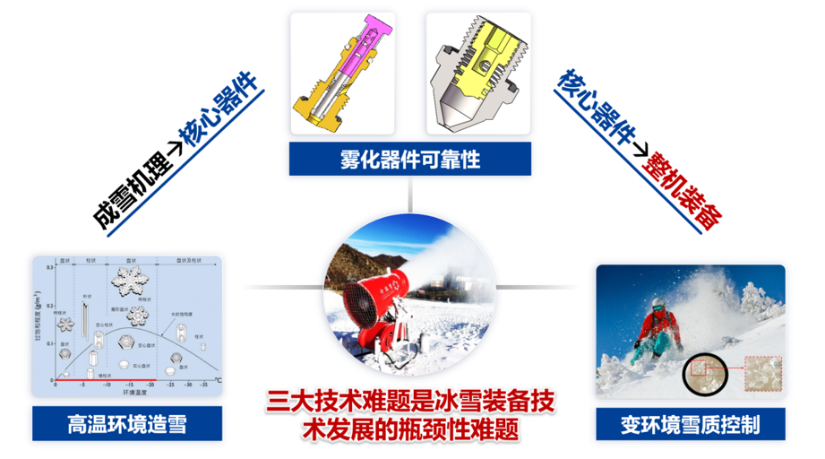 项目简介:项目属于低温制冷领域,掌握竞技用雪造雪技术并产业支撑“三亿人参与冰雪运动”属国家战略,关键在于突破地域气候条件对人工造雪的限制,扩大成雪区域、延长造雪时间。然而自主造雪机起步晚,核心技术长期被欧美垄断。项目团队针对“高环境温度造雪、大雪量雪质控制和高可靠性核心部件创制”等卡脖子问题,开展产学研用联合攻关,突破了“高环温、大雪量、高品质”造雪技术,研发出了满足国际赛事要求的自主品牌造雪装备,成果主要服务于冰雪竞技体育赛事和全民冰雪运动。