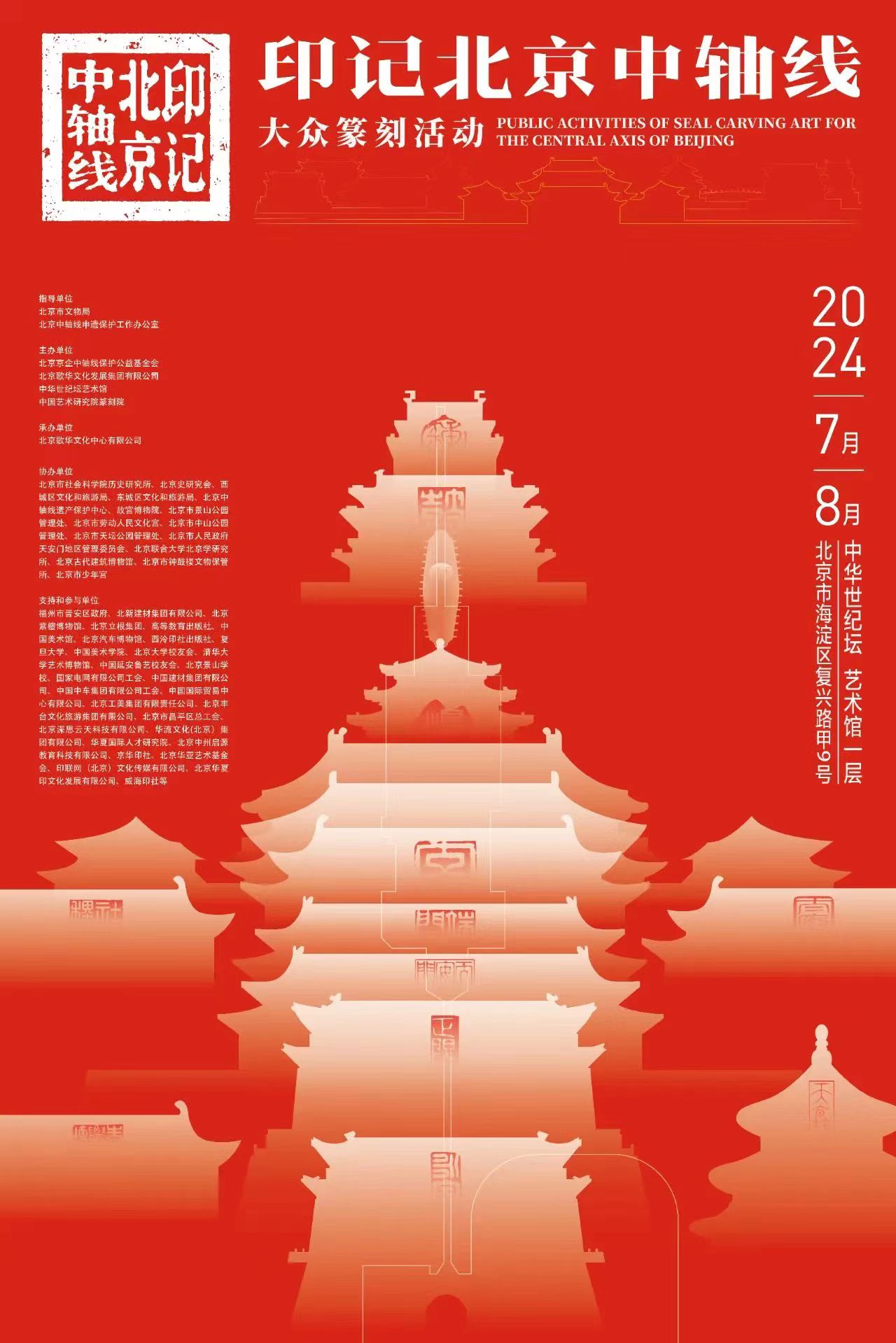 北京中轴线是北京老城的灵魂和脊梁,作为中国传统文化多样性的空间载体,是东方文明古都规划建设的最高成就,北京中轴线自元大都建都七百五十余年来,一直统领着城市功能与空间格局。展览围绕中轴线主题,通过遗产中轴、文脉中轴、活力中轴几个维度依次展开,展出的篆刻作品,以中国篆刻艺术独有的方寸之美呈现象天法地、中正和合、礼乐交融的壮美中轴精神标识。