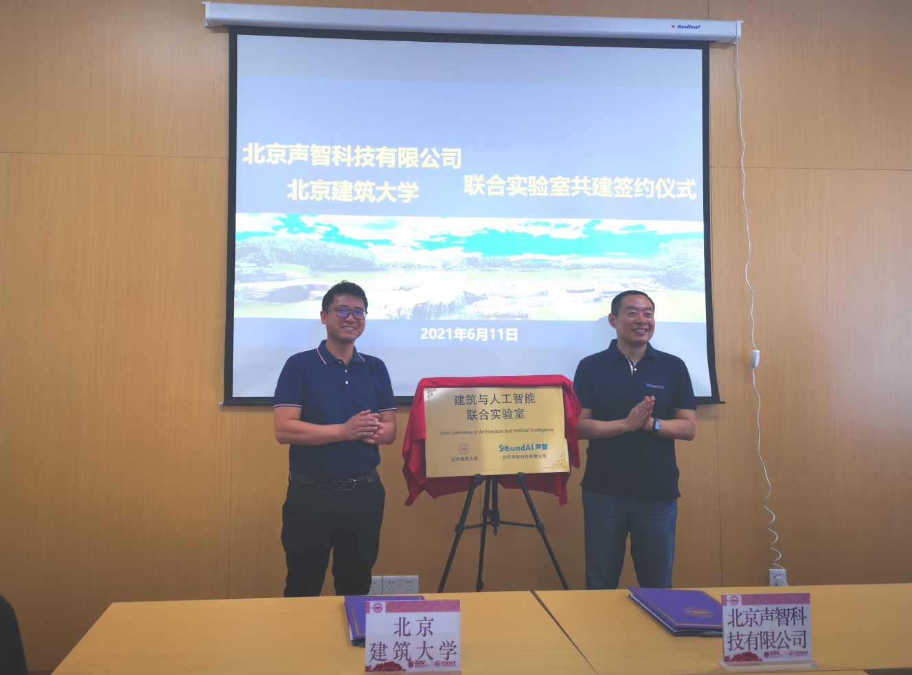 6月11日上午,学校与北京声智科技有限公司签署“建筑与人工智能联合实验室”联合共建协议并举行了揭牌仪式和合作交流研讨会,双方商定建立定期交流和总结机制,聚焦城市更新、建筑遗产防灾检测性保护、声景观环境营造、医养建筑、建筑安全防灾等方面展开深入合作。北京声智科技有限公司参会领导包括董事长兼CEO陈孝良、 联合创始人兼CTO冯大航、联合创始人兼CKO常乐、智慧城市事业部总经理周治国、总经理助理朱亚冰、人力资源总监王悦、品牌公关经理周林。学校参会人员包括科学技术发展研究院副院长周理安,建筑与城市规划学院副院长李春青、院长助理俞天琦、建筑系主任郝晓赛、技术部主任邹越、城乡规划系教师苏毅等,电气与信息工程学院马鸿雁副院长、周若华教授等。签约仪式及座谈交流会由李春青副院长主持。