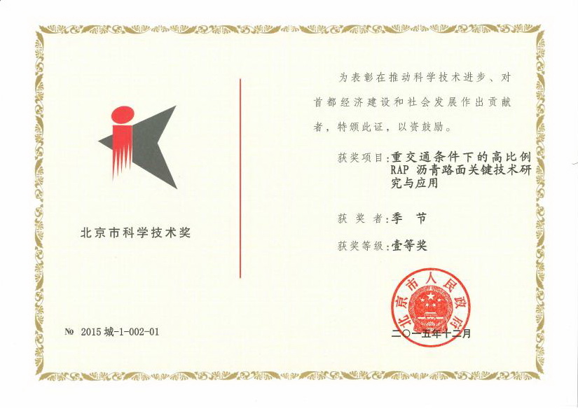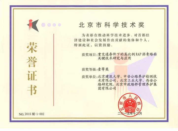 2016年2月19日,北京市委、市政府在北京会议中心隆重举行2015年北京市科学技术奖励大会。按照北京市政府“关于2015年度北京市科学技术奖励的决定”,我校土木学院季节教授主持的《重交通条件下的高比例RAP沥青路面关键技术研究与应用》荣获北京市科学技术奖一等奖。会上中共中央政治局委员、北京市委书记郭金龙,北京市委副书记、市长王安顺等市委市政府领导向获奖项目代表颁发了获奖证书。我校季节教授及科技处负责同志参加了表彰大会。