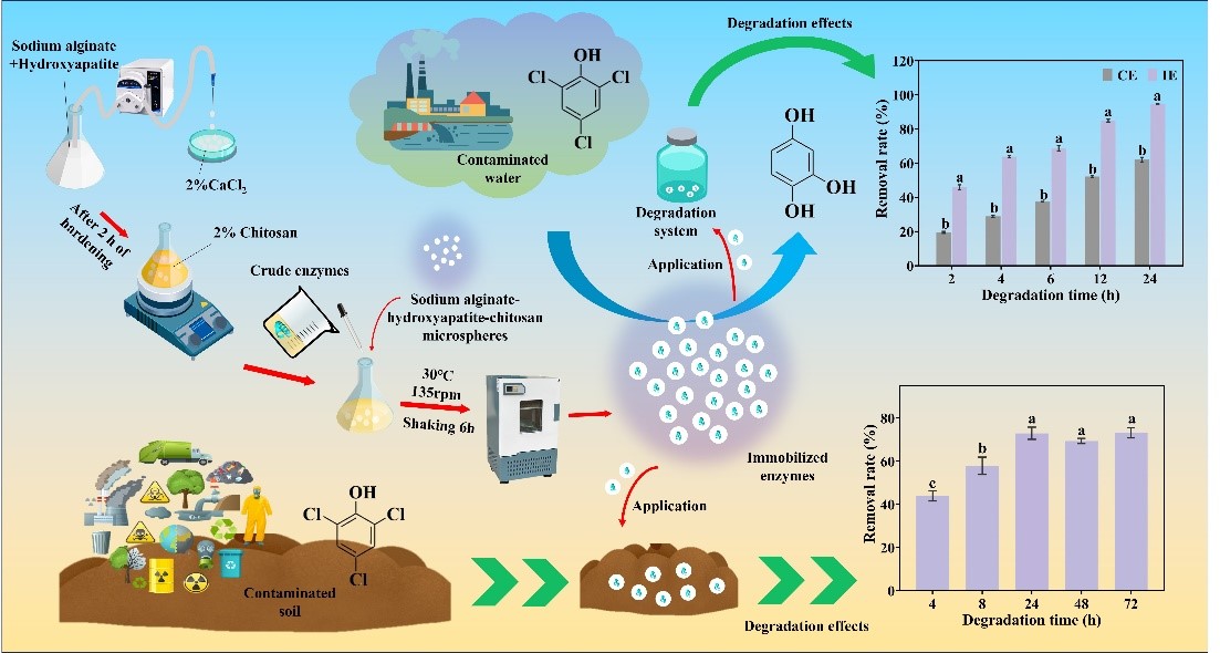 团队采用安全无毒可降解的羟基磷灰石、海藻酸钠和壳聚糖为载体原料,制备了一种新型海藻酸钠/羟基磷灰石/壳聚糖多孔微球载体,通过吸附作用固定白腐真菌胞外粗酶,并对其固定化条件优化至最佳结果显示:与游离粗酶相比固定化粗酶的pH、温度以及储藏稳定性显著提高。利用冷冻电镜和傅里叶红外光谱等表征手段,明确白腐真菌胞外粗酶在多孔微球上的固定状态。最后将固定化粗酶应用于2,4,6-三氯苯酚污染水体和土壤修复,并探究不同浓度、不同时间下固定化粗酶对2,4,6-三氯苯酚的降解机制与效果,为其在环境污染治理中的潜在应用提供了科学依据同时为酶固定化技术的发展提供了新的方向。
