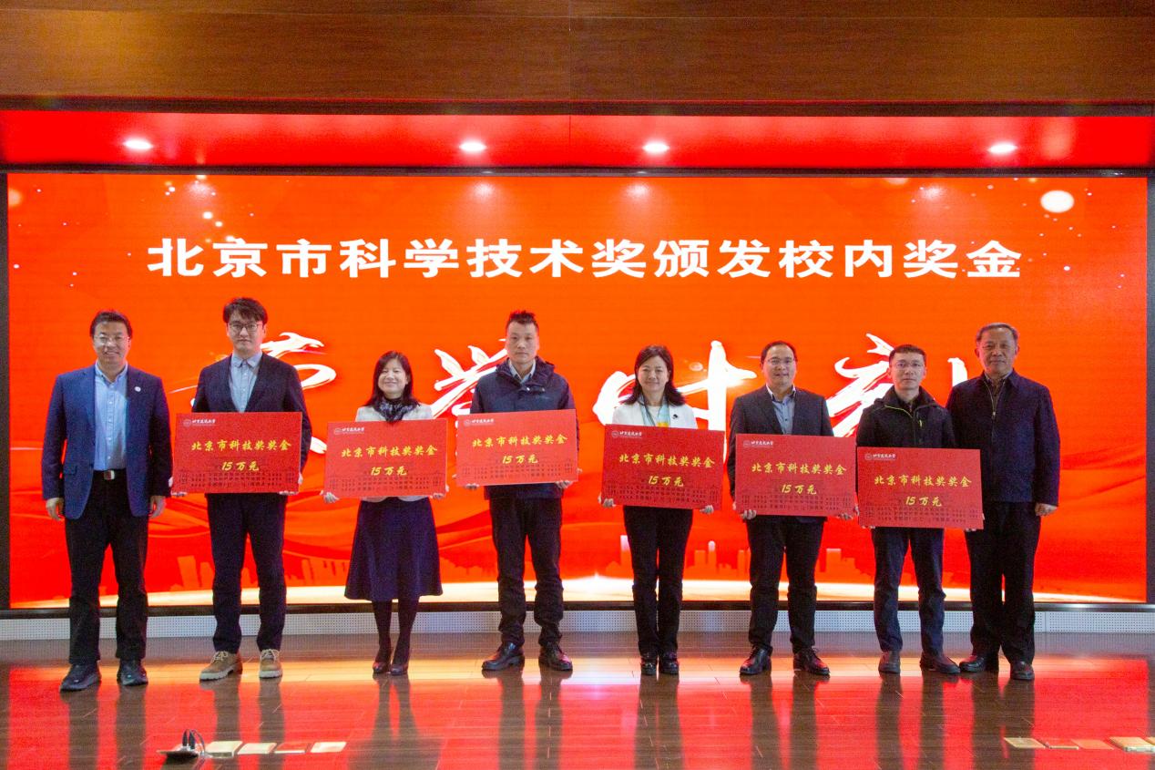 会上,郑宇、张大玉为北京市科学技术奖获奖代表颁发校内奖金并合影留念。