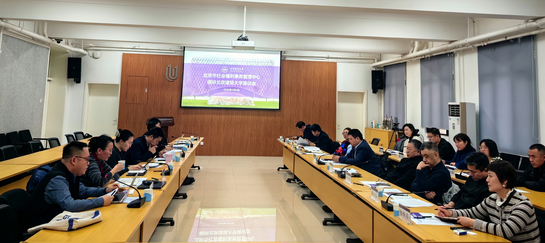 3月4日,北京市民政局福利事务管理中心副主任齐健一行来校调研交流。重大平台建设管理处处长王万鹏和对外交流合作处、建筑学院、土木学院、智科学院等相关专家参加会议。