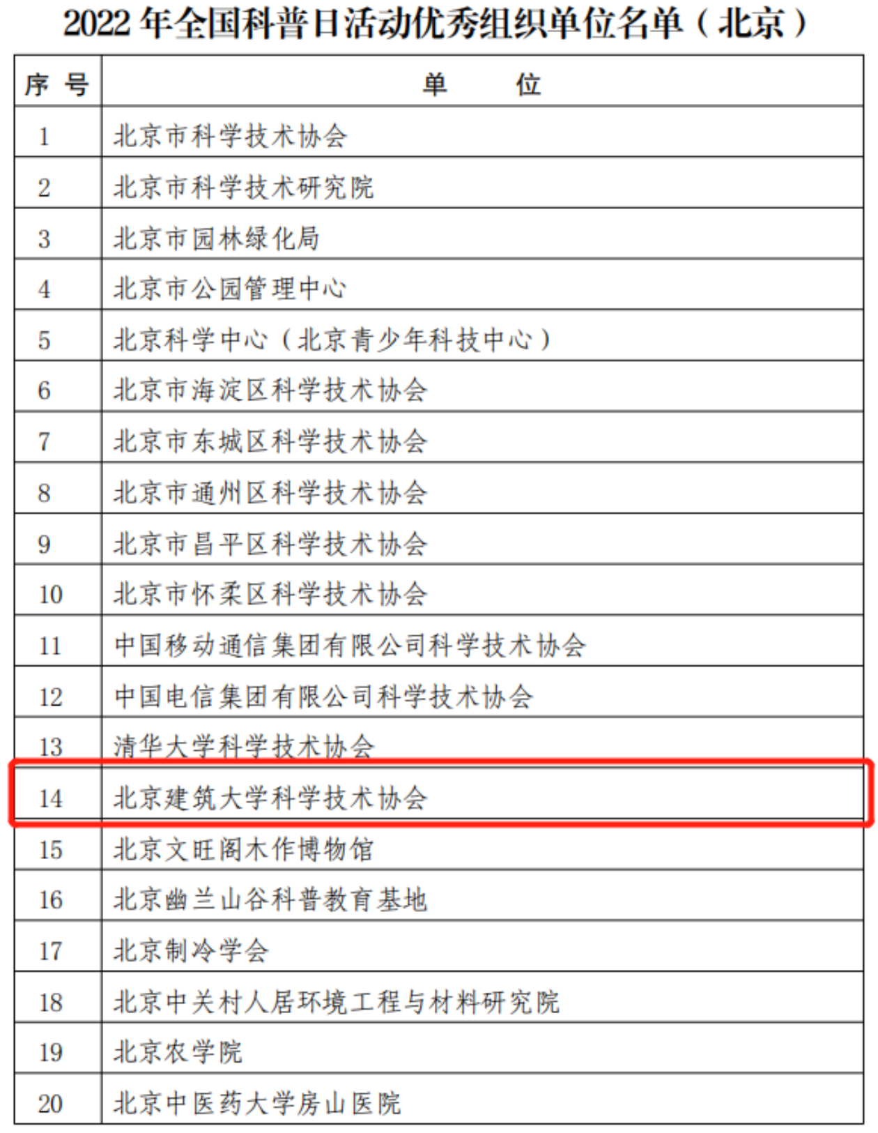 日前,中国科协发布《中国科协办公厅关于对2022年全国科普日有关组织单位和活动予以表扬的通知》(科协办函普字〔2022〕139号),我校科协首次获评2022年全国科普日活动优秀组织单位,北京市仅伟德国际1946源自英国科协、北京市科协、清华大学科协等20家单位入选。