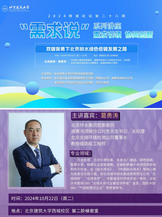 北京城市排水集团通惠河流域分公司总经理、教授级高级工程师葛勇涛受邀来校为明湖论坛-需求说2024第1期作《双碳背景下北京排水绿色低碳发展之路》主题讲座,为师生详细解析了北京中心城区排水、污染治理、水厂管网一体化建设、未来水厂建设、碳中和和碳减排等领域技术创新和代表性成果,并对城市排水低碳技术、人才培养等需求进行了重点讲述,学校师生近120余人积极参加并听取了本次讲座。现场讲座内容丰富精彩、学术氛围浓厚,师生反响热烈。