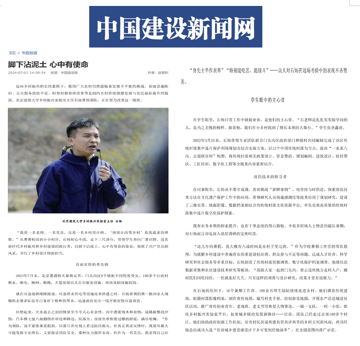 【转载《中国建设报》报道】石炀:脚下沾泥土 心中有使命